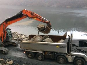 I dag, 9. desember, er 2 lastebilar, 1 traktor med hengar + gravemaskin i gang med å transportera vekk storstein som vert køyrt opp til NVE i Hyrpo.