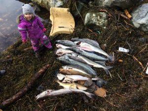 De kan sjå fram til å få båten i hamna; her er gårsdagens fangst! Det var sei, torsk, flyndre, hyse, hysing, pigghå og lyr. – Med andre ord litt av kvart, og mykje god mat! Dei største seiane vog 7-8 kg.